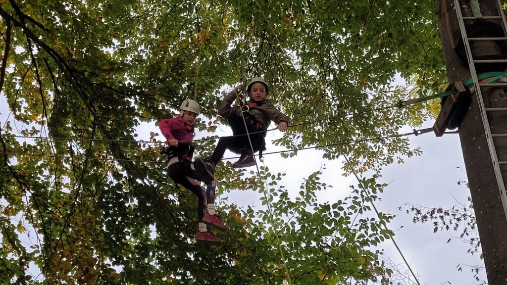 In den ersten beiden Tagen erkundeten wir die Burg und ihre Umgebung und verbrachten viel Zeit in der Natur. Ein besonderes Highlight unserer Walderlebniswoche erwartete uns zur Mitte der Woche: der Besuch im Klettergarten. Dort waren Mut und Teamarbeit gefragt. Für manche bedeutete es eine große Überwindung, in luftiger Höhe Aufgaben zu bewältigen – sei es das Überqueren einer wackeligen Seilbrücke oder der Sprung von einem Baumstamm in die Tiefe. Umso größer war am Ende der Stolz auf das, was wir geschafft hatten.