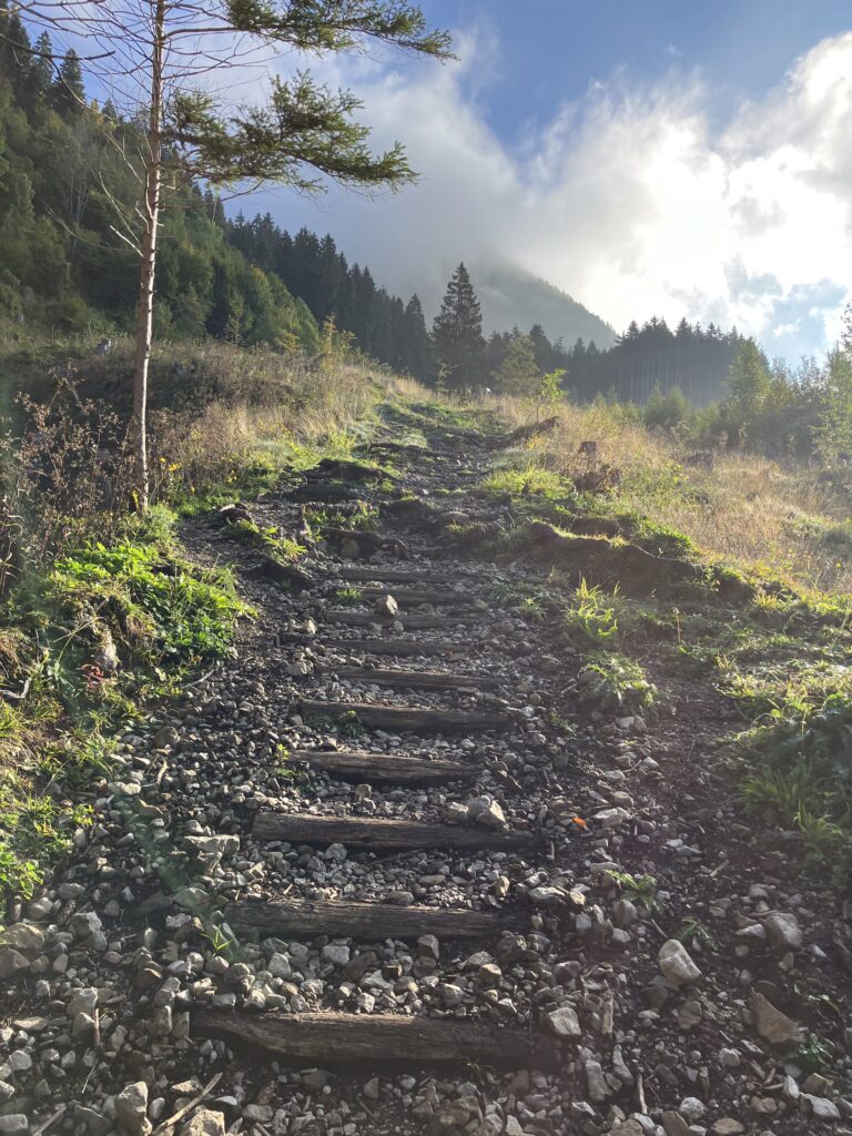 Nach einem Abend mit einigen Runden unterhaltsamer Spiele und einer geruhsamen Nacht wartete am Sonntag das Grüntenhaus auf uns. Von Burgberg aus wanderten wir hinauf, allmählich öffnete sich die Wolkendecke und auf der sonnigen und doch kühlen Terrasse ließen wir uns Kuchen und Kaiserschmarrn schmecken. Nach dieser Stärkung ging es wieder hinab, vorbei an Schwand- und Kehralpe; von der Sonne begleitet erreichten wir den Parkplatz in Burgberg wieder. Die Heimfahrt verlief staufrei und manchen erwartete zu Hause noch der Schreibtisch – oder, und auch das kann ein kleines Glück sein – eben nicht.