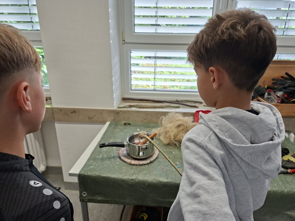 Im Workshop „Zurück in die Steinzeit“ hatten die Schülerinnen und Schüler unserer sechsten Klassen mit ihren Reiseführerinnen und Reiseführern vom Nürnberger „Museum im Koffer“ am 1. und 2. Oktober 2025 die Gelegenheit, eine Reise in die Steinzeit zu unternehmen. Die Geräusche, die aus dem Raum 007 nach außen drangen, bewiesen, dass die Kinder überaus eifrig, konzentriert und engagiert bei der Sache waren: Die Schülerinnen und Schüler konnten sich im Spinnen und Weben, in der Schmuckherstellung wie auch im Töpfern und Kochen nach einem jungsteinzeitlichen Rezept üben: Es gab leckeren Apfelbrei und ein selbstgebackenes Brot. Zusammenfassend bleibt in diesem kleinen Reisebericht festzuhalten, dass die Reisezeit wie im Fluge verging und alle wieder wohlbehalten und mit vielen spannenden Erfahrungen in der Jetztzeit auftauchten.