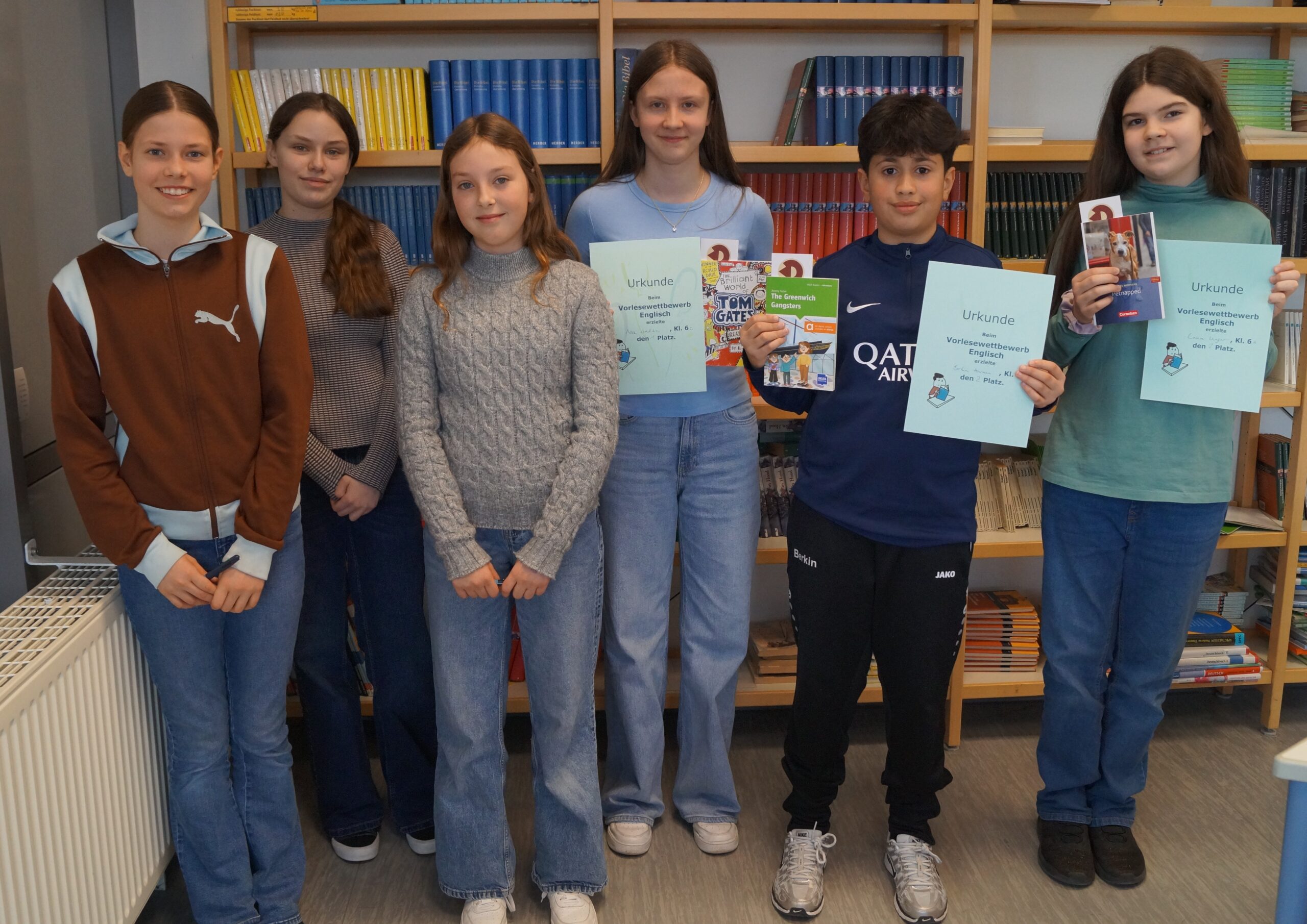 Am 11.3.2026 stellten die 6. Klassen wieder ihr Können im Vorlesen auf Englisch unter Beweis. Fünf Schülerinnen und ein Schüler traten gegeneinander an und präsentierten zunächst ca. zwei Minuten lang einen vorbereiteten Ausschnitt aus einem selbstgewählten Buch. Im Anschluss musste jeweils ein kurzer unbekannter Text vorgelesen werden. Die Jury, bestehend aus Frau Heim-Wich und Frau Reichert als Vertreterinnen der Fachschaft Englisch, achtete dabei auf Aussprache, Flüssigkeit und die lebendige Gestaltung des Vortrags. Nora Hadzic konnte in allen Bereichen am meisten überzeugen, dicht gefolgt von Berkin Hurman (beide 6c). Den dritten Platz belegte Laura Unger (6a), den vierten Platz teilten sich Marie Arlt, Ariana Klar (beide 6b) und Melinda Maul (6a). Gratulation allen, die teilgenommen haben!