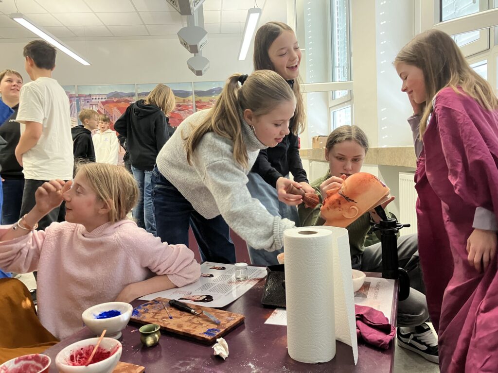 Nach etwas Theorie ging man schnell zur Praxis über, die Schülerinnen und Schüler konnten sich zum Legionär ausrüsten, an anderen Stationen wurde Kupferschmuck gebastelt, auch eine Schreibstube mit Papyrus, Feder und Tinte war eingerichtet. Wer die Mathematik vorzog, konnte sich mit dem Abacus schwere Rechnungen erleichtern. Auch Jungs versuchten sich in der Herstellung und am Auftragen von Schminke und besondere Konzentration herrschte bei der Vorbereitung einer typisch römischen Alltagsmahlzeit, die im Anschluss bei bester Stimmung eingenommen wurde. Gereicht wurden Moretum (Käsebällchen mit Knoblauch und Kräutern an Weißbrot und Oliven) und als Dessert feine Plätzchen aus Quark und Gries in Öl herausgebacken, mit Honig und Mohn verfeinert (Globi).