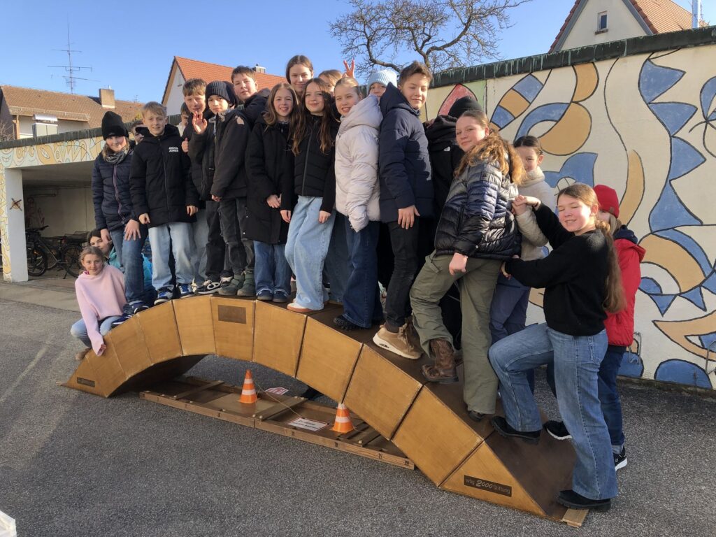Weil wir herrliche Sonne hatten, ging es für die letzte Aktion hinaus: Aus Quadern sollten die Kinder in Kooperation einen stabilen Torbogen errichten. Schnell stand das Konzept für eine tragfähige Architektur, die Umsetzung forderte das abgestimmte Mitwirken aller Beteiligten. Am Ende stand die ganze Klasse auf dem Bogen, niemand musste fürchten, dass das Bauwerk einstürzen könnte.